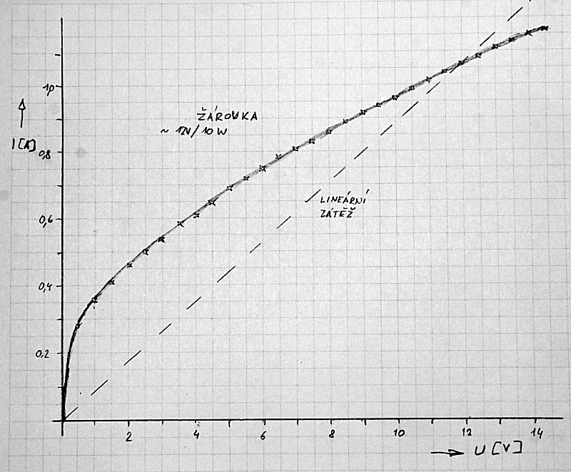S oblibou používáme žárovku jako zátěž při testech zdrojů. Výhoda spočívá v tom, že žárovka má nelineární voltampérovou charakteristiku. Co tedy znamená nelineární voltampérová charakteristika? Vysvětlení podá graf (obr. 1). Jsou na něm dva průběhy. Čárkovanou čarou je naznačen průběh zátěže s lineární charakteristikou - nejčastěji rezistor. Vidíme, že proud zátěží roste přímo úměrně s napětím na zátěži. Naproti tomu křivka, kterou je vyznačena tato závislost u žárovky, zpočátku prudce roste, postupně se ale stává plošší. Vidíme, že v horní části je změna proudu žárovkou v závislosti na změně napětí o dost menší, než u obyčejného odporu. Toho právě využíváme při testech zdrojů, kdy je důležitý dlouhodobý test konstantním proudem. Změny proudu žárovkou při změnách napětí (ať již vlivem změn napětí v elektrovodné síti, či záměrně, např. test baterie u ústředen) jsou tak mnohem menší. Fyzikálně je to dáno tím, že většina vodičů zvyšuje svůj měrný odpor s teplotou. Proto rozžhaveným vláknem žárovky teče mnohem menší proud, než studeným.