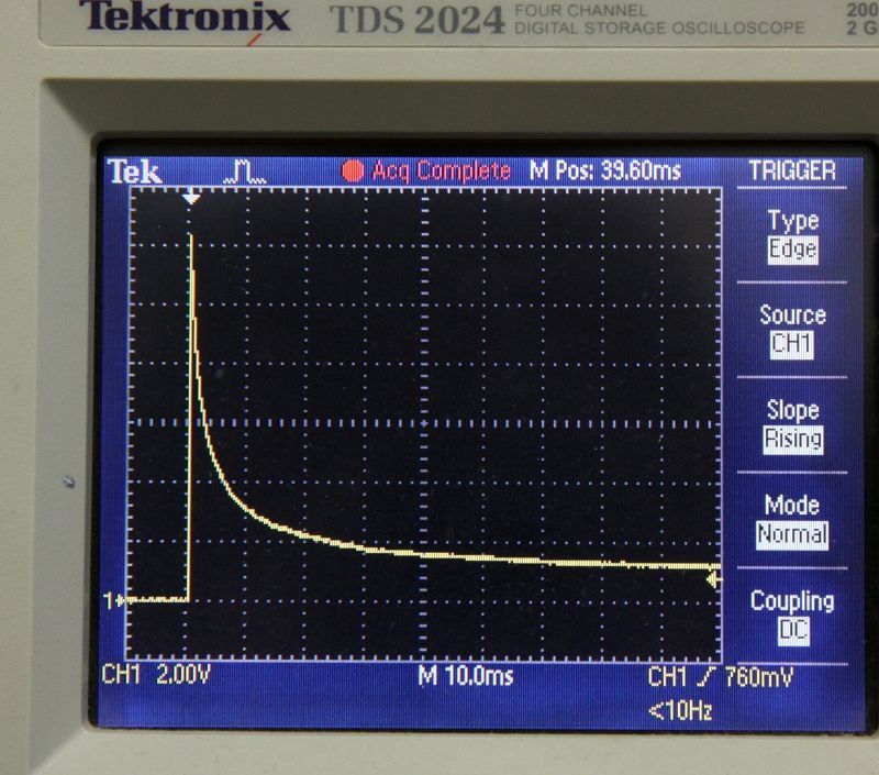 Minule jsem psal o žárovce, jako o vhodné zátěži pro dlouhodobé testování zdrojů. Vysvětlil jsem též, že studeným vláknem teče větší proud, než rozžhaveným. Tuto skutečnost je třeba brát v potaz, testujeme-li zdroj s automatickou pojistkou proti zkratu, či nadměrnému odběru. K názorné ukázce posloužila oblíbená žárovka "suffit" s odběrem ca. 1,1A při 12V. Z grafu, sejmutého z obrazovky osciloskopu je patrné, že proud v prvním okamžiku po připojení je mnohonásobně vyšší, než ustálený, a k nominální hodnotě se blíží postupně s ubíhajícím časem. Konkrétně zde je patrné, že špičková hodnota po připojení dosáhla téměř 13 A, což je více, jak desetinásobek trvalého proudu! Ještě po 5 ms je hodnota asi 5 A; na nominální hodnotu se proud usadí teprve až po asi 80 ms. Je-li zdroj vybaven pouze tavnou pojistkou, či vratnou pojistkou (např. AUX u ústředen MG a SP), prvotní špička nevadí, protože tyto pojistky mají při určitém nadproudu delší vybavovací dobu, než je oněch 80 ms. Avšak zdroje vybavené elektronickou pojistkou, která reaguje téměř okamžitě (např. ústředny EVO), zcela jistě odpojí výstup. Jsou na to fígle, jak tomu zabránit, ale o tom zase příště.