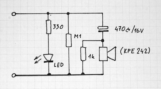 K akustické signalizaci se používá miniaturní piezosirénka*, např. typ KPE242. Objeví-li se na vstupu napětí, sirénka jen krátce pípne a po zbytek času je ztichlá; trvající stav oznamuje led dioda. Krátké pípnutí způsobuje kondenzátor, který je v klidu vybitý. Přijde-li napětí, na sirénce se objeví napětí a začne pískat. Zároveň se kondenzátor začne nabíjet a napětí na sirénce klesá. Až je kond. nabitý, pískání ustane. Vybití kondenzátoru zajišťuje sestava odporů a led dioda, takže při dalším příchodu napětí sirénka opět zapíská. Při hodnotách uvedených na obrázku trvá pípnutí asi vteřinu. Přitom platí,