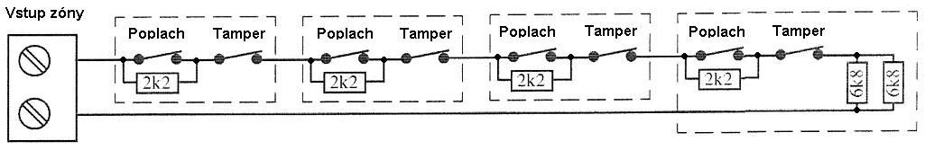 Toto zapojení je vhodné pro zařízení, která mají poplachový i tamperový kontakt v klidu sepnutý (NC).