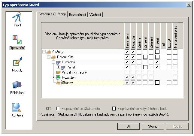 Má-li zaškrtávací pole oprávnění jednoduchý černý okraj umožňuje pouze „zdědění“, je jedno jaké jednotky následují. Např. kliknete-li na zatržítko „Řízení“ na stránce, můžete ovládat všechny ústředny na této stránce.