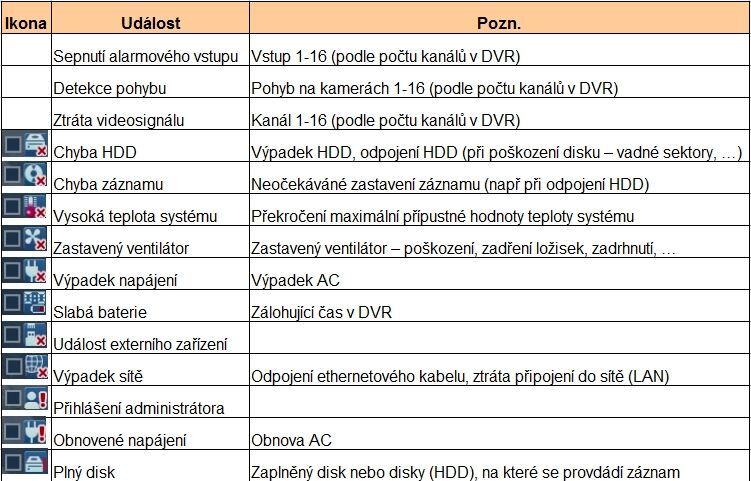 PDR-M6004/6008/6016 může na mail zaslat různé informace o stavu DVR. K událostem je možné i připojit fotku z patřičných kamer. Seznam událostí, které DVR může na mail zasílat naleznete v níže uvedené tabulce:
