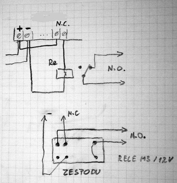 Jednoduchý návod, jak vyrobit kontakt NO, mám-li k dispozici čidlo s kontaktem pouze NC, ukazuje obrázek. Kontaktem NC ovládám vnější relé. Doporučuji relé typ M3 / 12V. Má přepínací kontakty a relativně nízkou spotřebu. Tímto relé ale nejde spínat napětí z elektrorozvodné sítě, takže pokud by byla potřeba, musí se použít relé vyhovující.Kontakt nc na čidle je připojen na jeden konec vinutí relé a na napájecí napětí. Druhý konec relé je připojen na opačný pól napájení. V klidu je kontakt nc sepnut, tudíž proud teče vinutím cívky, relé je přitaženo a kontakt NO rozepnut. Jakmile čidlo zaznamená pohyb, proud relé se přeruší, kotva odpane a kontakt NO sepne. Při použití tohoto zapojení je nutno mít na paměti nevýhody - relé není tak spolehlivé, jako polovodičový spínací prvek (optofet) a dále je citlivé na napájecí napětí. Pokud je tato kombinace umístěna na konci dlouhého přívodu, hrozí, že napětí klesne pod mez, kdy relé spolehlivě ovládá kotvu.