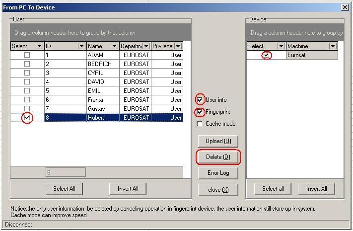 3. V tabulce vlevo (User) vybereme uživatele, jehož data chceme ze čtečky vymazat, vpravo vybereme čtečku (Device), ze které chceme uživatele vymazat. V prostředním sloupci zvolíme zda vymazat údaje o uživateli (User info) nebo otisk uživatele (Fingerprint). Smazání kterékoli položky zabrání čtečce v rozpoznání otisku a čtečka nepovolí přístup.