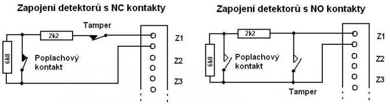 - Při zapojení NO byla v programování zóny nastavena v Menu 7.0 volba „Přehodit stav klid – poplach“.