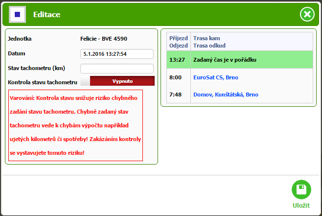 Odpověď : systém při zadávání stavu tachometru kontroluje počet ujetých kilometrů. Pokud je zadána hodnota, která je systémem vypočtena, jako nekorektní, je nutno přepnout tlačítko na "Vypnuto" u kolonky "Kontrola stavu tachometru". Typickým příkladem je zadávání prvního stavu tachometru pro nové vozidlo v systému, kdy je stav tachometru defaultně nastaven na 0 km.