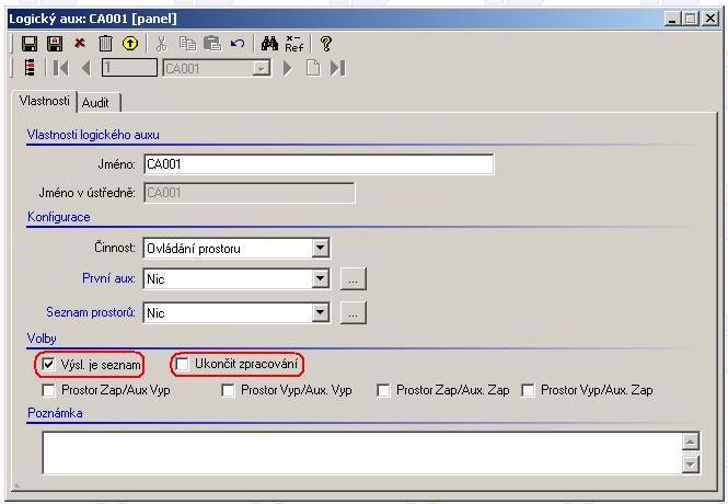 Vybereme-li v programování logických auxů funkci „Ovládání prostoru“, zobrazí se dialogové okno zahrnující i volby „Výsl. je seznam“ a „Ukončit zpracování“.