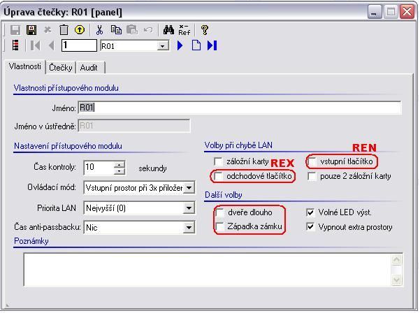 - REX – odchodové tlačítko, REN vstupní tlačítko (není vyžadován zakončovací rezistor EOL)