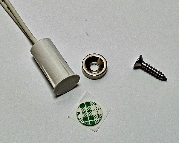 Závrtný magnetický kontakt bílý, kontakt NC. Délka vodič 45cm.