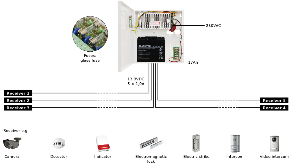Stabilizovaný pulsní zdroj 12V/5A/5x1A/17Ah. Vhodné pro 5 kamer. Vstupní napětí: 176÷264VAC/ 50Hz, Výstupní napětí: 5A/12VDC.
