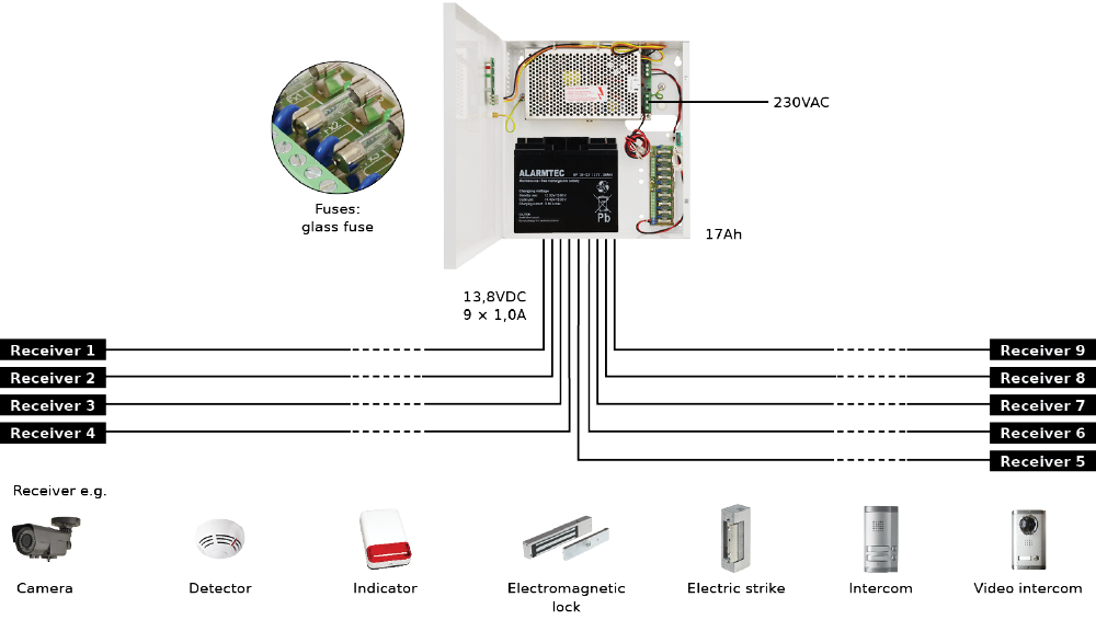 Stabilizovaný pulsní zdroj 13,8V/9A/9x1A/17Ah. Vhodné pro 9 kamer. Vstupní napětí: 176÷264VAC/ 50Hz, Výstupní napětí: 9A/12VDC.