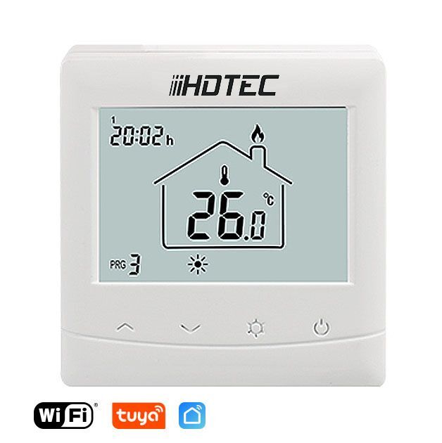 SMART WiFi prostorový termostat pro regulaci topení. Dvě NTC čidla teploty pro měření prostorové teploty a podlahového vytápění. WiFi IEEE802.11b/g 2.4GHz konektivita, napájení 230VAC, výstup relé se zátěži až 16A, rozsah regulovatelné teploty 5~80℃. Podpora cloud Tuya, Alexa, Google Assist, Rokid a jiné.