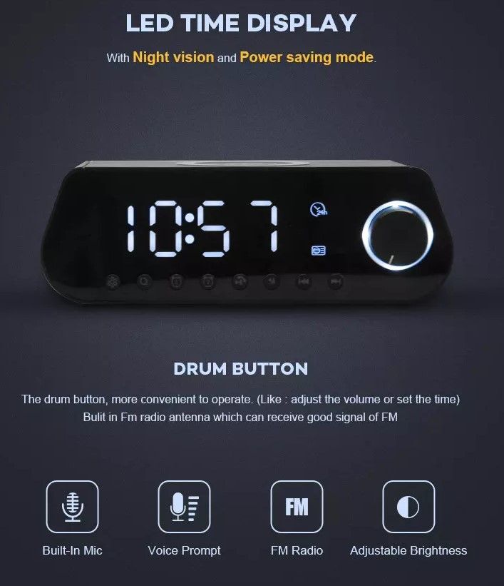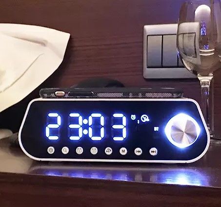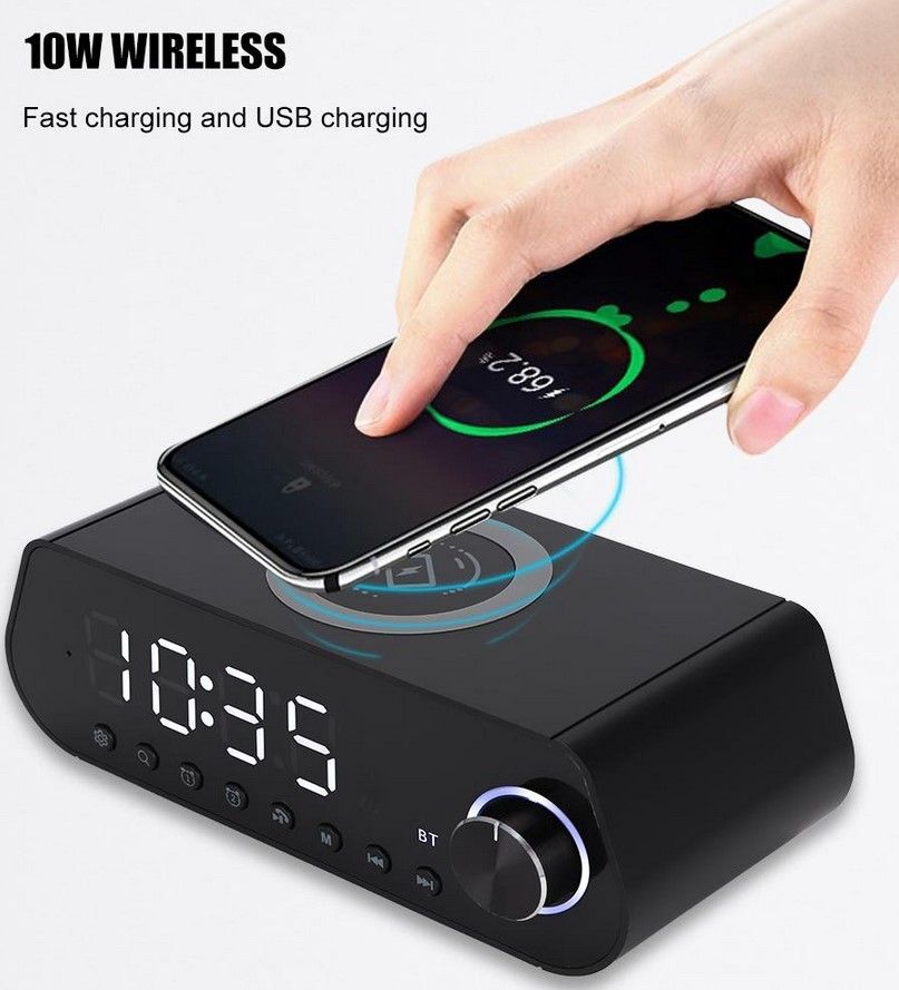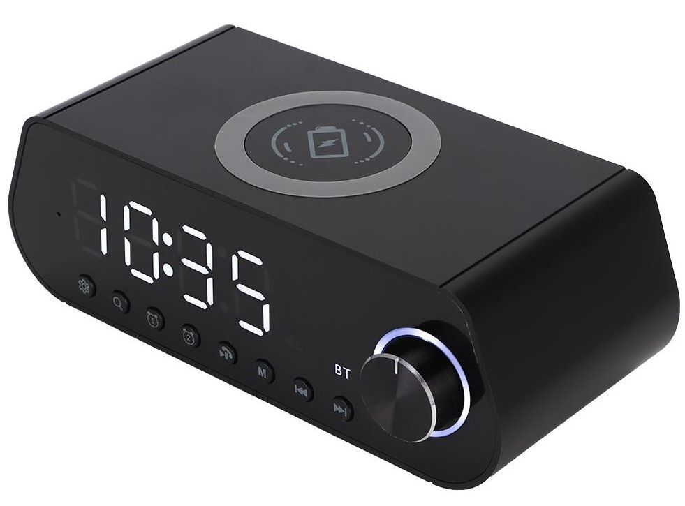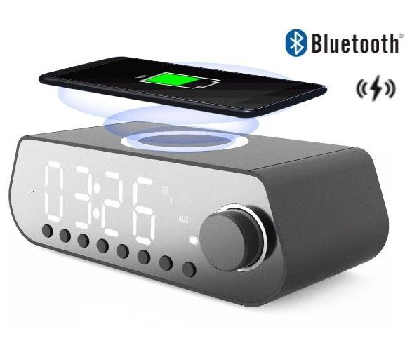 Bluetooth reproduktor, FM radiobudík s bezdrátovým nabíjením mobilního telefonu.