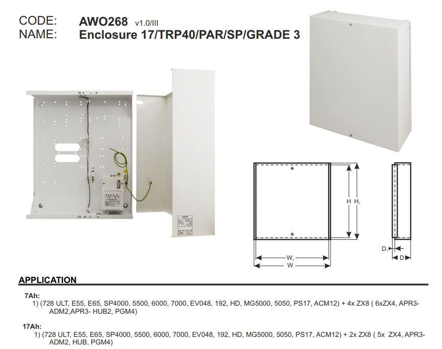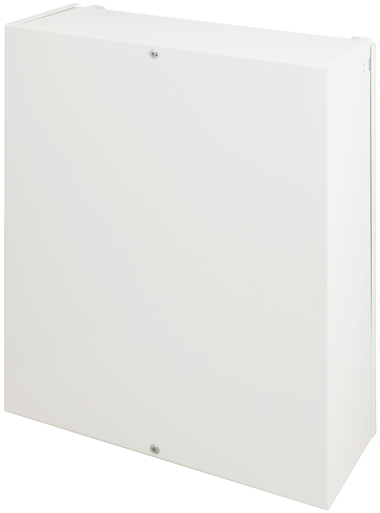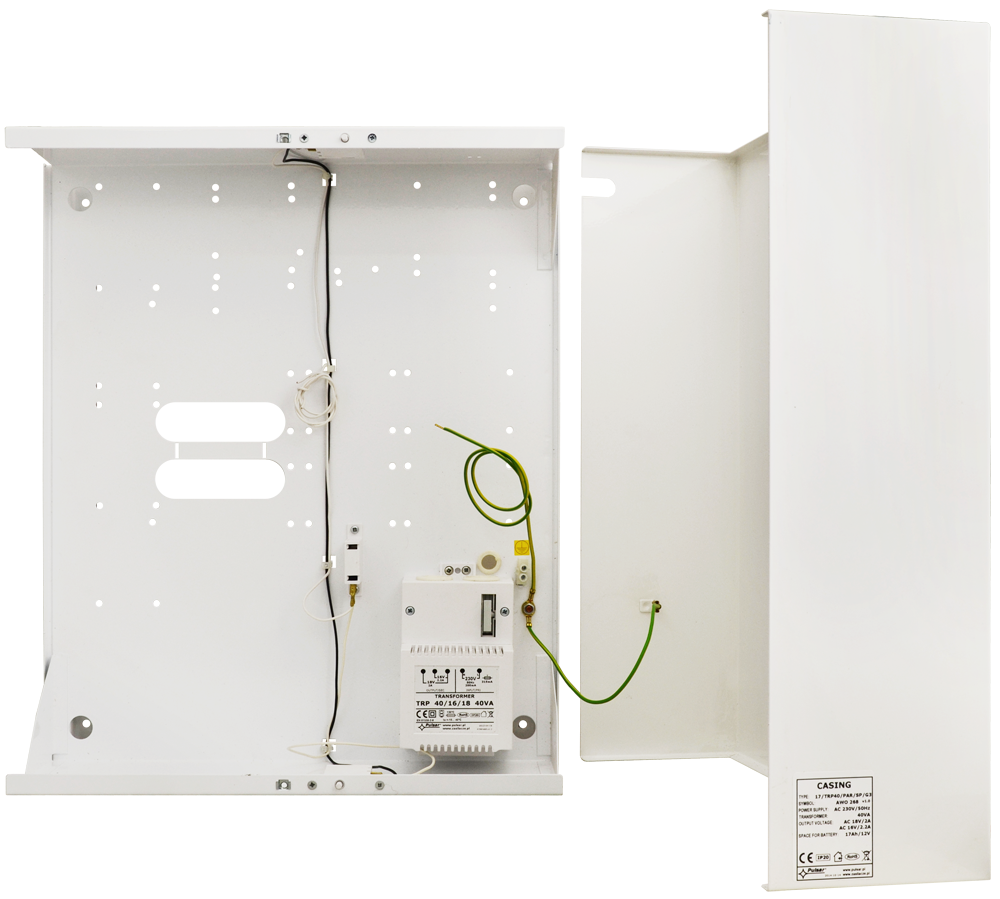 Kryt ústředny s TR 40VA pro splnění podmínek 3 kategorie. Velikost 340 x 400 x 130mm s 2x tamperem otevření skříně a sejmutí ze stěny, instalovaným transformátorem 18/40 VA, provedené pospojování, prostor pro 17Ah akumulátor, 8mm distanční mezera od zdi. Předvrtané otvory pro ústředny Esprit, Spectra, Digiplex