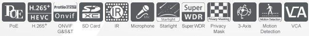 | Spouštění události | VCA, detekce pohybu, odpojení sítě, Audio, tamper alarm proti neoprávněnému vniknutí |