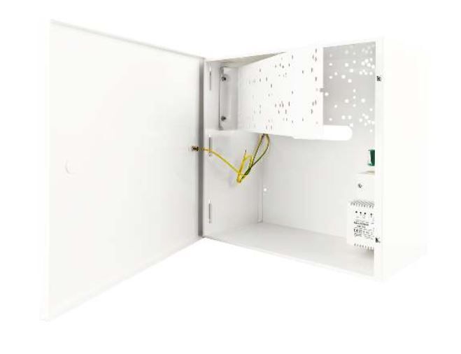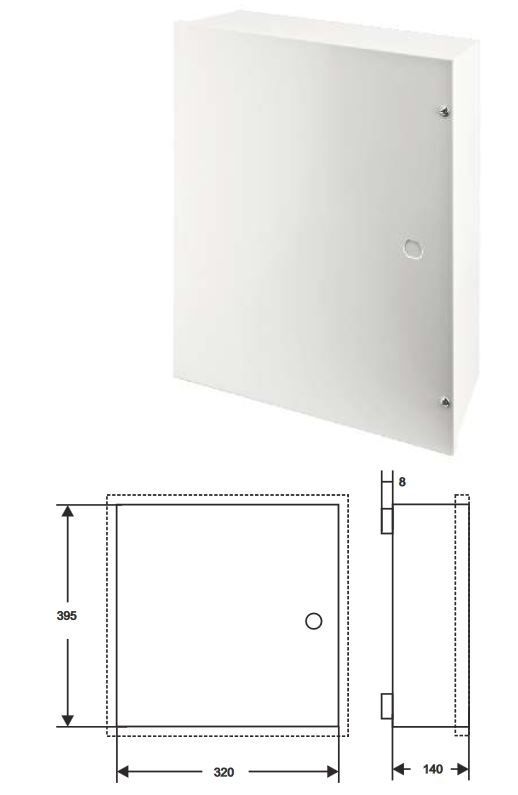 Dvojúrovňový kryt ústředny 320x395x140mm s instalovaným transformátorem 18/50 VA, přídavná montážní základna, ochranný kontakt, provedené pospojování, prostor pro 17Ah akumulátor, 8mm distanční mezera od zdi. Předvrtané otvory pro různé modely PCB ústředny.