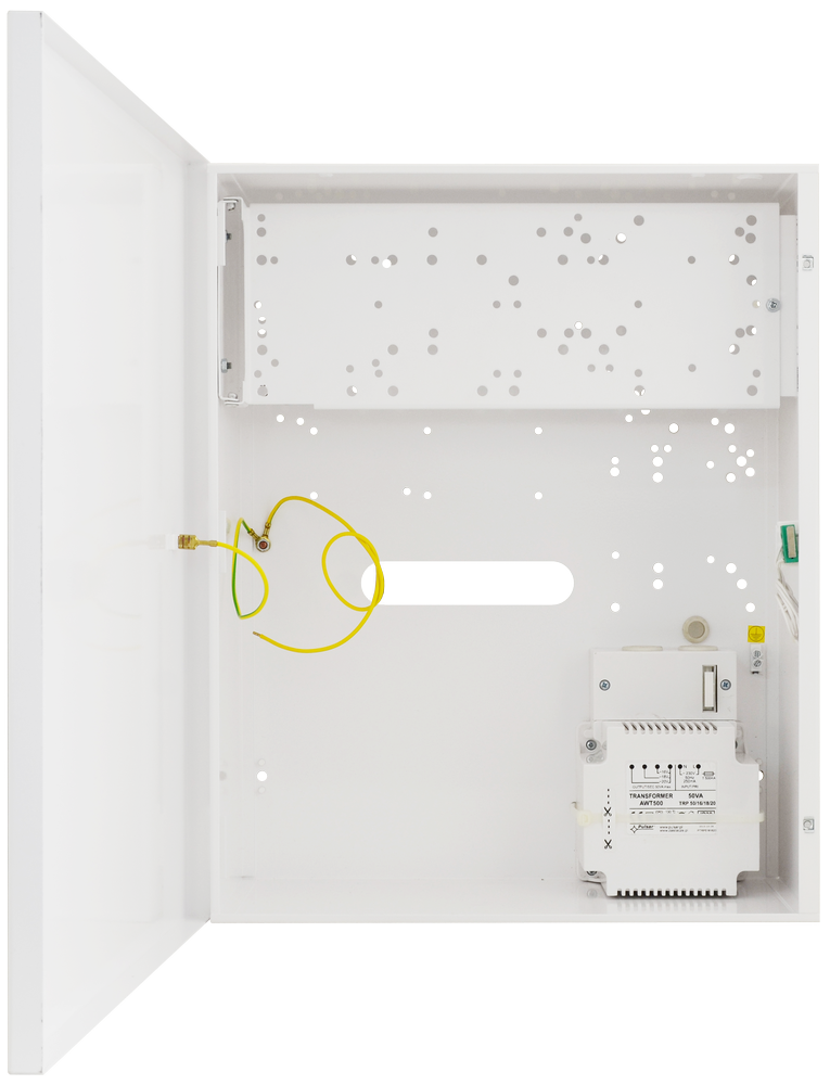 Kryt ústředny 320 x 300 x 90 mm s instalovaným transformátorem 16VAC/45VA, ochranný kontakt TAMPER, provedené pospojování, prostor pro 17Ah akumulátor, 8mm dist...