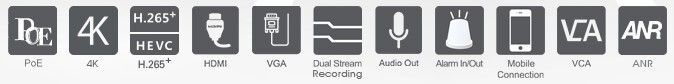 HDMI 3840x2160/60Hz, 3840x2160/30Hz, 1920x1080/60Hz, 1920x1080/50Hz, 1280x1024/60Hz, 1280x720/60Hz, 1024x768/60Hz. Podpora audio HDMI VGA 1920x1080/60Hz, 1920x1080/50Hz, 1280x1024/60Hz, 1280x720/60Hz, 1024x768/60Hz. Dual Stream Rozlišení nahrávky 8MP/6MP/5MP/4MP/3MP/1080P/ UXGA/720P/D1/VGA/CIF/QCIF |