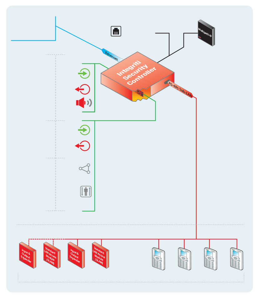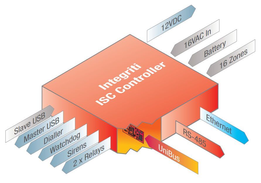 Integriti Security Controller (ISC) zabezpečovací ústředna Integriti. Zahrnuje BOX stabilizovaný zdroj 2 A, 16 zón s možností rozšíření UniBus moduly až na 32, 2 reléové auxy rozšiřitelné až na 32, integrovaný port TCP/IP, USB port pro upgrade firmware, telefonní modem...