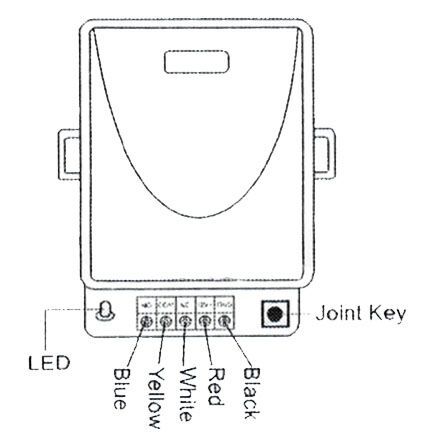 Joint Key - krátkým stlačením tlačítka stlačením klíče se přidá ovladač a LED zabliká - delším stlačením tlačítka se ovladač smaže. Popis konektoru: Black - zem napájení Red - napájení +12VDC White - NC výstup relé, v klidu sepnuto Yellow - COM Blue - NO výstup relé, v klidu rozepnuto |