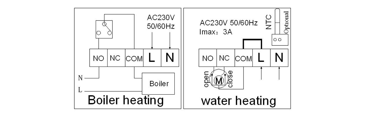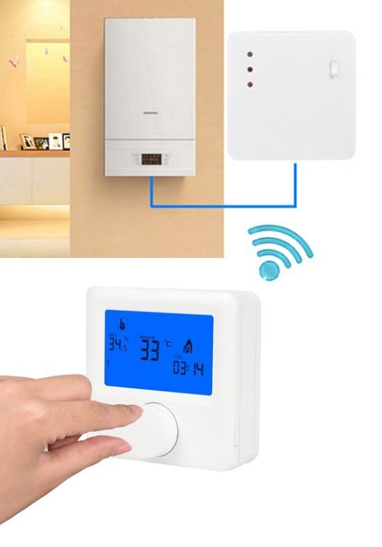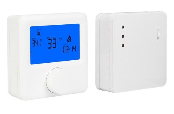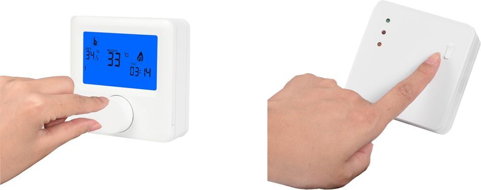 Bezdrátový prostorový termostat pro regulaci topení. NTC čidla teploty pro měření prostorové teploty, napájení vysílače 2x AA, přijímač 230 VAC, beznapěťový výstup NO/NC relé se zátěži až 5 A / 230 VAC, rozsah regulovatelné teploty 5 ~ 80 ℃