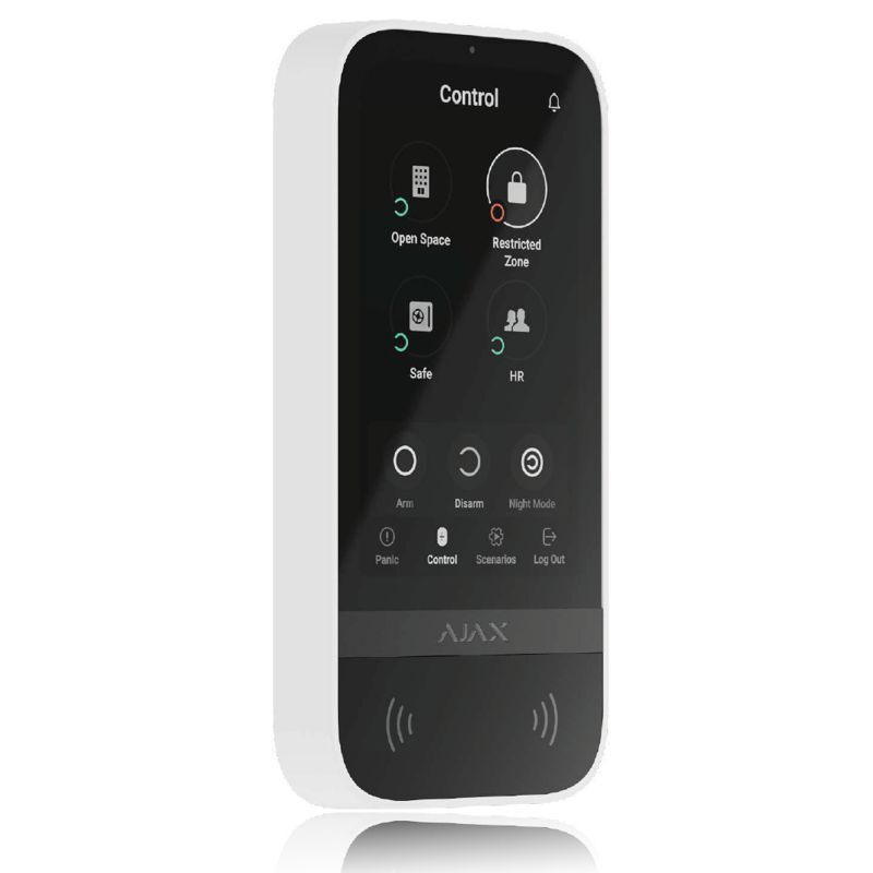 Ajax KeyPad TouchScreen - Bezdrátová klávesnice s dotykovou obrazovkou a bezkontaktní autorizací.Pětipalcová dotyková obrazovka umožňuje rychlý přístup k aktuálnímu režimu zabezpečení, má zvukovou indikaci a může upozorňovat na alarmy, zpoždění při vstupu/odchodu a otevření dveří při odjištění systému. Zobrazuje výsledek kontroly integrity systému a informuje o poruchách při zastřežení. Barva - bílá
