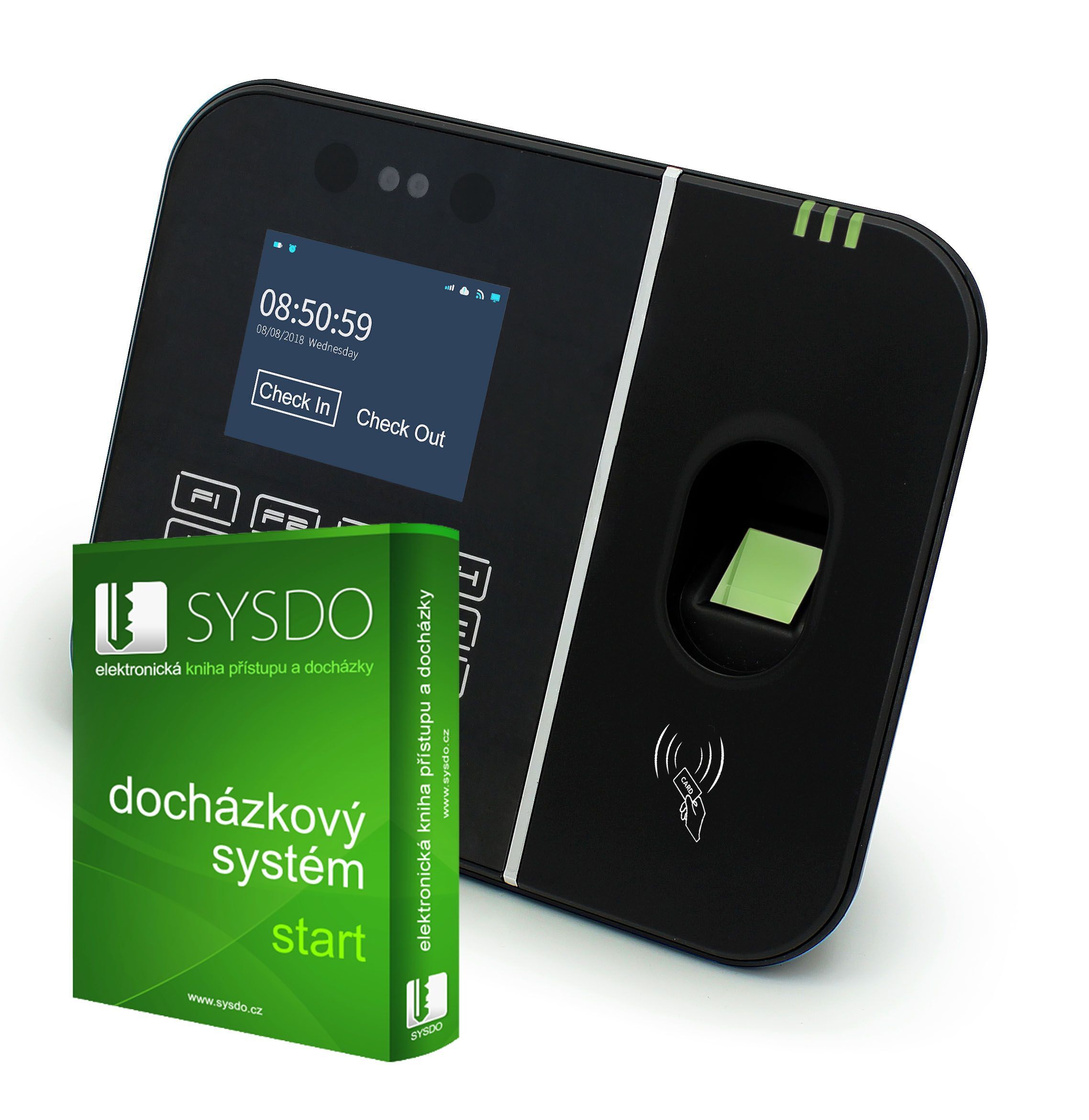 Docházkový a přístupový terminál SYSDO je kompletně vybaven pro evidenci a kontrolu přístupu osob pomocí rozpoznání obličeje, biometrického snímání otisků prstu a ID čipu. Čtečka podporuje TCP/IP P2P komunikaci pomocí rozhraní Ethernet portu, LCD dotykový displej, komunikační port Wegand, USB. Čtečka je připravená a nakonfigurovaná s účtem do on-line WEB aplikace SYSDO, kde lze kompletně čtečku konfigurovat podle potřeby uživatele.