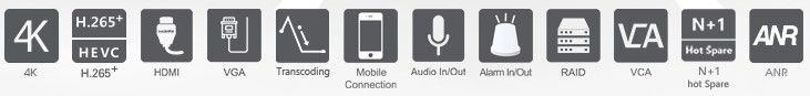 4K NVR 16 IP kamer, bez POE, obousměrný datový tok 160Mbps/RAID, podpora kamer až 12MP, komprese obrazu H.265+/H.265 / H.264+/H.264 / G.711, synchronní přehrávání, videoanalýza obrazu, 2xLAN, podpora 4x HDD 10TB (SATA 3.5"), podpora RAID, 3x USB, 1x audio I/O, 16x/4x alarm vstupy/výstupy, 1x RS232, 2x RS485, 4K UHD 2160P výstup HDMI/ a 1x VGA , napájení 230V, rozměry 440x320x67mm, váha 4.1Kg