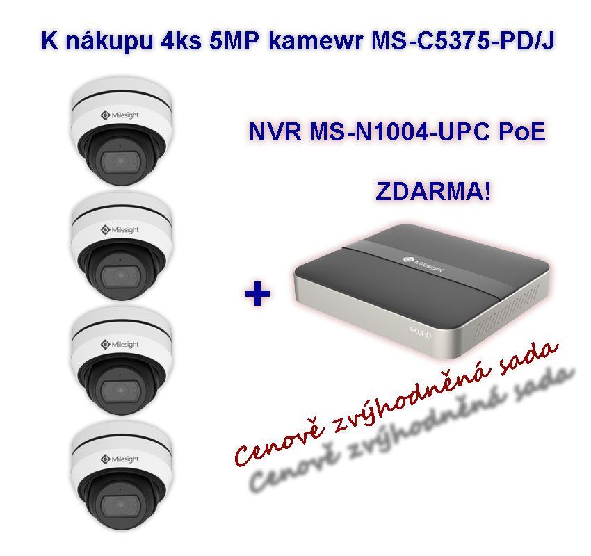 Cenově zvýhodněná sada 4ks 5MP kamer s NVR zdarma. Sada obsahuje NVR MS-N1004-UPC s PoE a 4ks 5M
