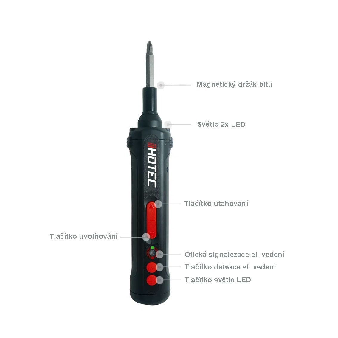 Akumulátorový MINI šroubovák/svítilna/detektor el. vedení. Vyměnitelné bity, max. točivý moment 5N.m, max otáček 250/min, kapacita lithium ion akumulátoru 1500mAH, nabíjení přes USB-C 5VDC,