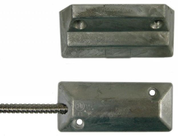 Hliníkový příložný magnetický kontakt s armovanou hadicí pro plošnou montáž především na vodivé materiály. Kontakt NC