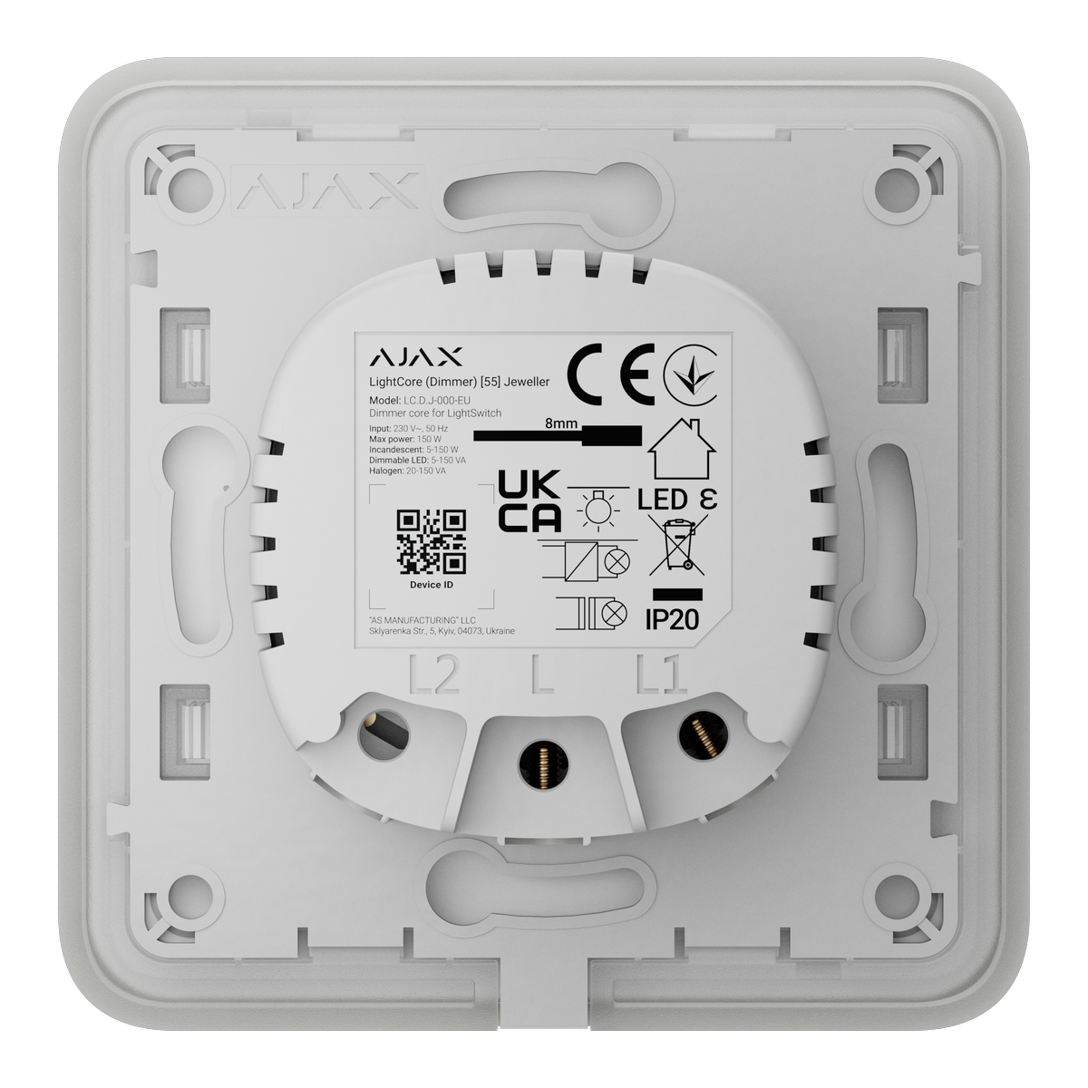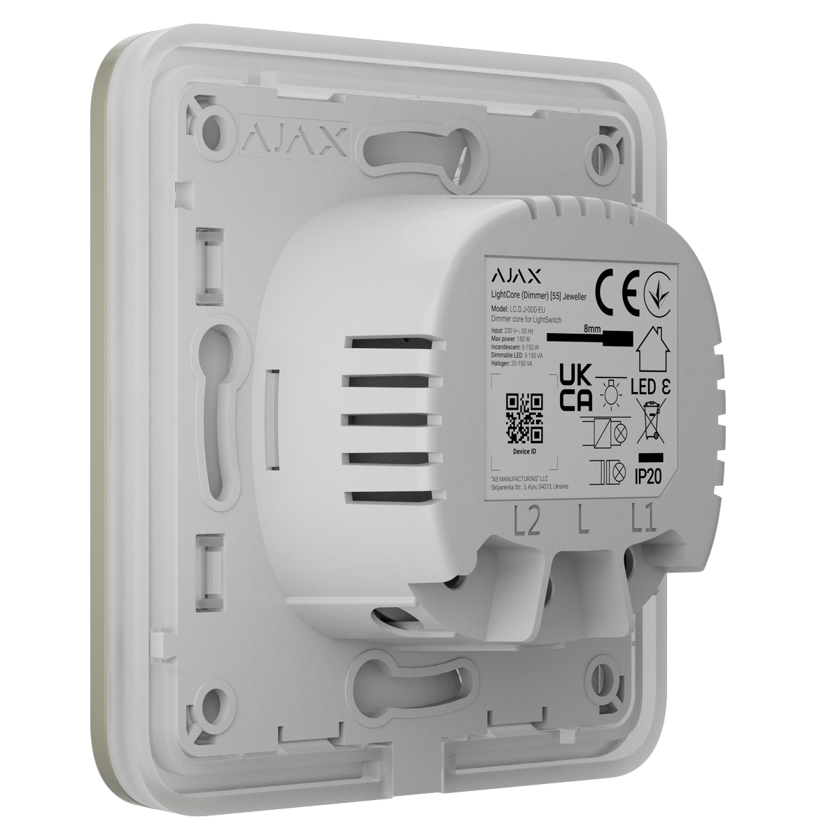 Ajax LightSwitch Dimmer Jeweller je chytrý dotykový nástěnný stmívač pro osvětlení určený pro vnitřní instalaci.