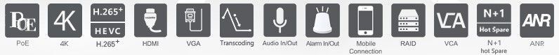 4K PoE NVR 16 IP kamer, 16x POE 200W, max. obousměrný datový tok 160Mbps/200RAID, podpora kamer až 12MP, komprese obrazu H.265+/H.265 / H.264+/H.264 / G.711, synchronní přehrávání, videoanalýza obrazu, podpora 4x HDD 10TB (SATA 3.5"), podpora RAID, 3x USB, 1x audio I/O, 16x/4x alarm vstupy/výstupy, 1x RS232, 2x RS485, 4K UHD 2160P výstup HDMI/ a 1x VGA , napájení 230V, rozměry 440x390x67mm, váha 4.89Kg