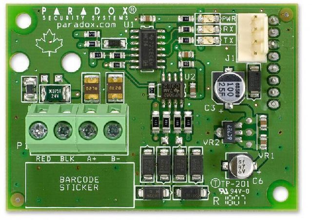 RS485 převodník. Modul umožňuje připojit k ústředně modul PCS250 a PCS265LTE na vzdálenost až 300 metrů.
