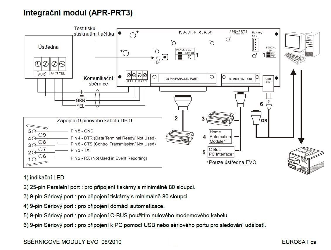 Komunikační modul APR-PRT3 slouží k propojení s domácí automatizací nebo manuálnímu tisku událostí v systému. Modul je použit jako interface mezi Vaším zabezpečovacím systém a systémy domácí automatizace, modul podporuje komunikační protokoly ASCII a C-BUS. Tato funkce modulu umožňuje využívat ústředny DIGIPLEX EVO k integraci do jiných nadstavbových a SW systémů a zároveň spolupracovat s dalšími technologiemi v objektu, např. EPS, CCTV, docházkové systémy a podobně. Nedochází k žádnému zvýšení zranitelnosti ústředny, zůstává zachována integrita a uzavřenost EZS jako celku. Podpora domácí automatizace je možná s ústřednami EVO192 a EVOHD.