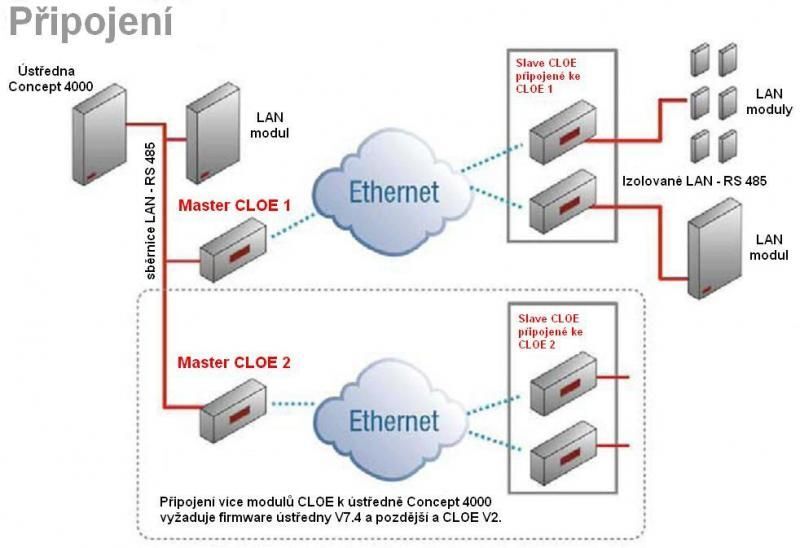 V jednom LAN systému Concept 4000 může být použito několik modulů Master s Slave. CLOE využívá standardní TCP/IP protokol a všechny data jsou šifrovány 128 bit AES šifrou. Ethernetový port modulu CLOE zajišťuje rovněž galvanické oddělení částí LAN, obdobně jako modul LAN izolátoru.