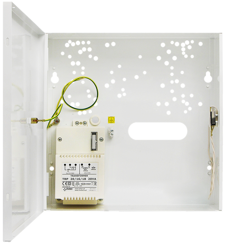 Kryt ústředny 250 x 290 x 80 mm s instalovaným transformátorem 18/30 VA, ochranný kontakt "TAMPER, provedené pospojování, prostor pro 7Ah akumulátor, 8mm dist...
