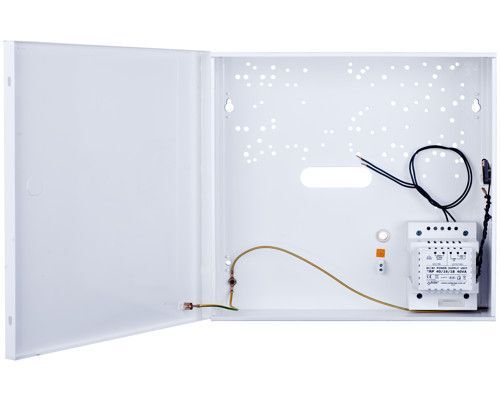 Kryt ústředny 320 x 300 x 90 mm s instalovaným transformátorem 16V/18V/40 VA, ochranný kontakt "TAMPER", provedené pospojování, prostor pro 17Ah akumulátor, 8mm distanční mezera od zdi. Předvrtané otvory pro ústředny Esprit, Spectra, D