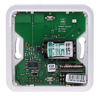 Obsahuje tamper kontakt a monitoruje stav vybití baterie.