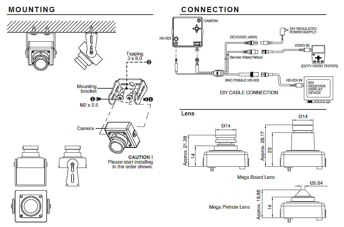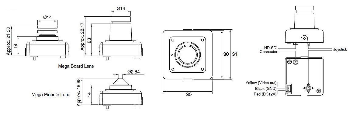 Miniatúrna 3x3cm FULL HD SDI CCTV kamera s MP objektívom 4.3mm, 2,4MP 1/3“ Panasonic CMOS, rozlíšenie 1920x1080/30fps, citlivosť 0.1Lux, WDR/BLC, 3DNR, digitálny 20x ZOOM, digitálny DEŇ&NOC, privátne zóny, pohybový detektor, odstup S/N max. 50dB, OSD, BNC video výstup HD-SDI a TV PAL/NTSC, napájanie 12VDC, odber 120mA, rozmery 30x30mm