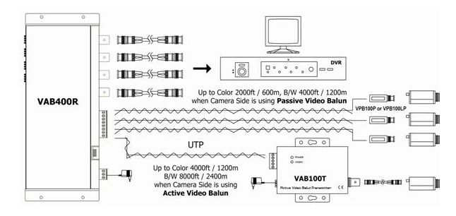 4 kanálový pasivní převodník videosignálu pro přenos po TWIST páru, podpora nestíněného UTP vedení, s UTP kabelem CAT5e přenos barevného obrazu až na 400m nebo B/W až 600 m. Jednoduché zaojení, spolehlivost s pasivním provozem bez napájení.