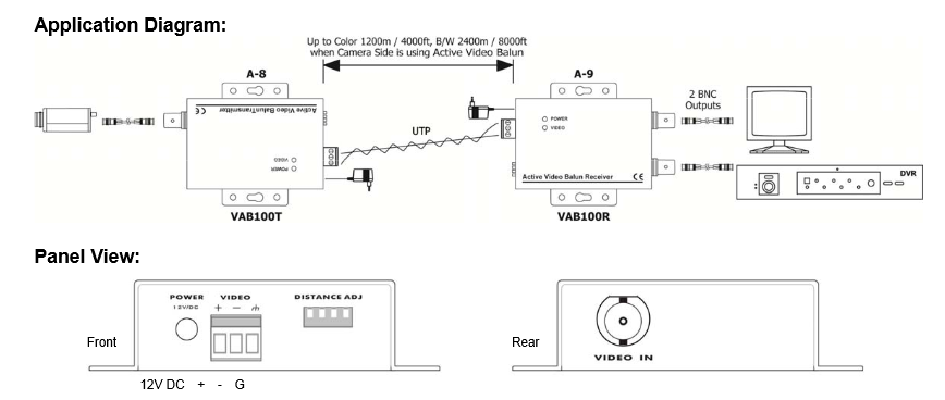 Aktivní vysílač převodníku z TWIST pár na BNC video, určený pro přenos až na vzdálenost 1500m při použití aktivního přijímače VAB100R. Rozměry 115 x 83 x 22 mm, napájení 12VDC/100mA.