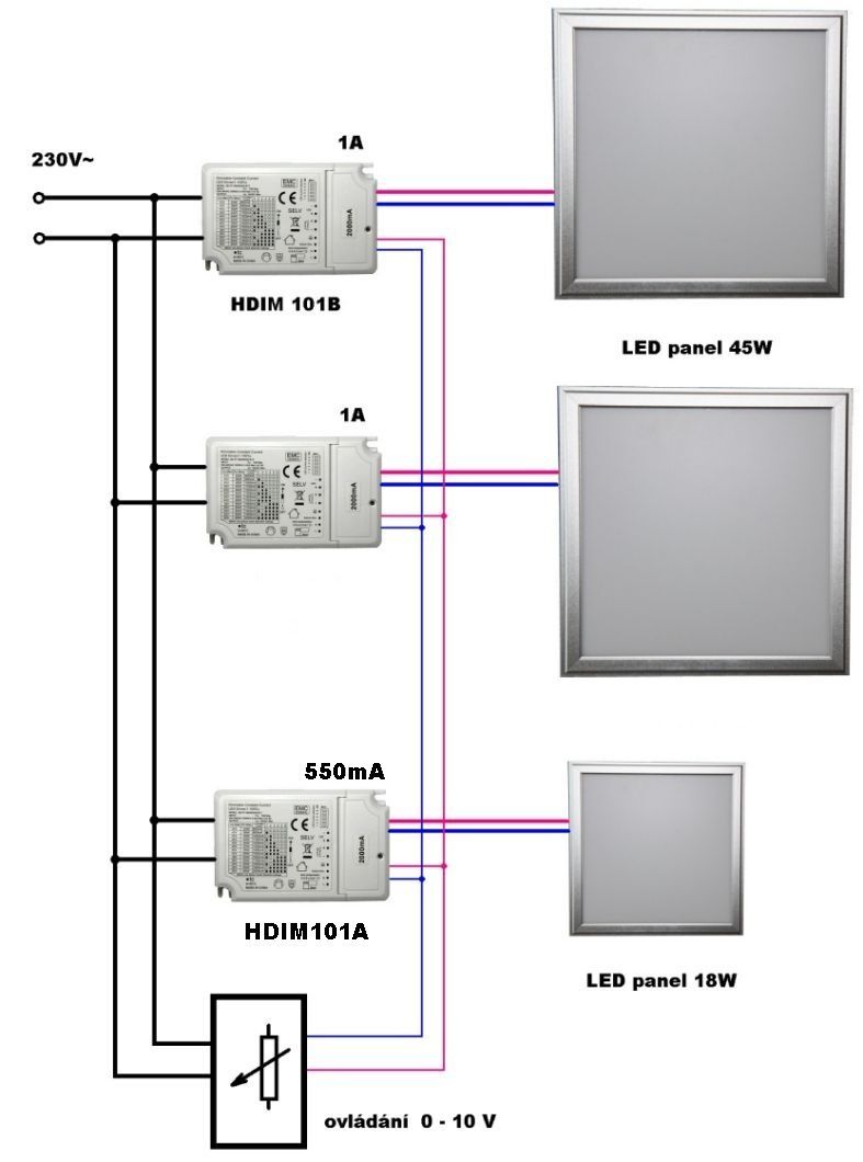 stmívání malých panelů HDIM101A. Zapojení lze kombinovat. Původní