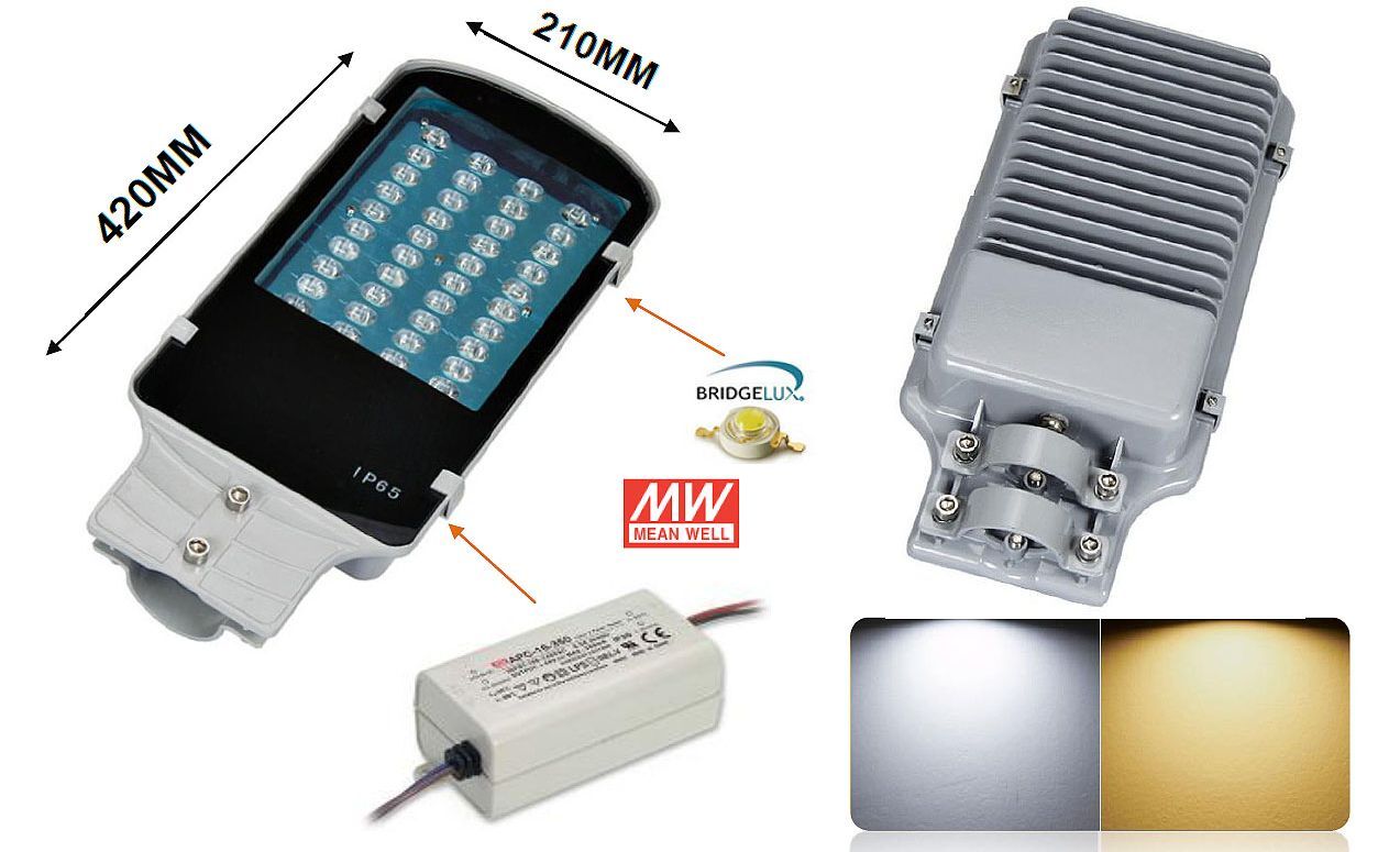 Venkovní LED světlo veřejného osvětlení 40W/230VAC, neutrální 4500-5000°K bílá barva světla, rozptyl světla 120°, 40x LED COP BRIDGELUX, světelný tok 4100lm, plnohodnotnou náhradou za 120W sodíkovou vysokotlakou lampu, instalace na výložník o průměru 60mm.