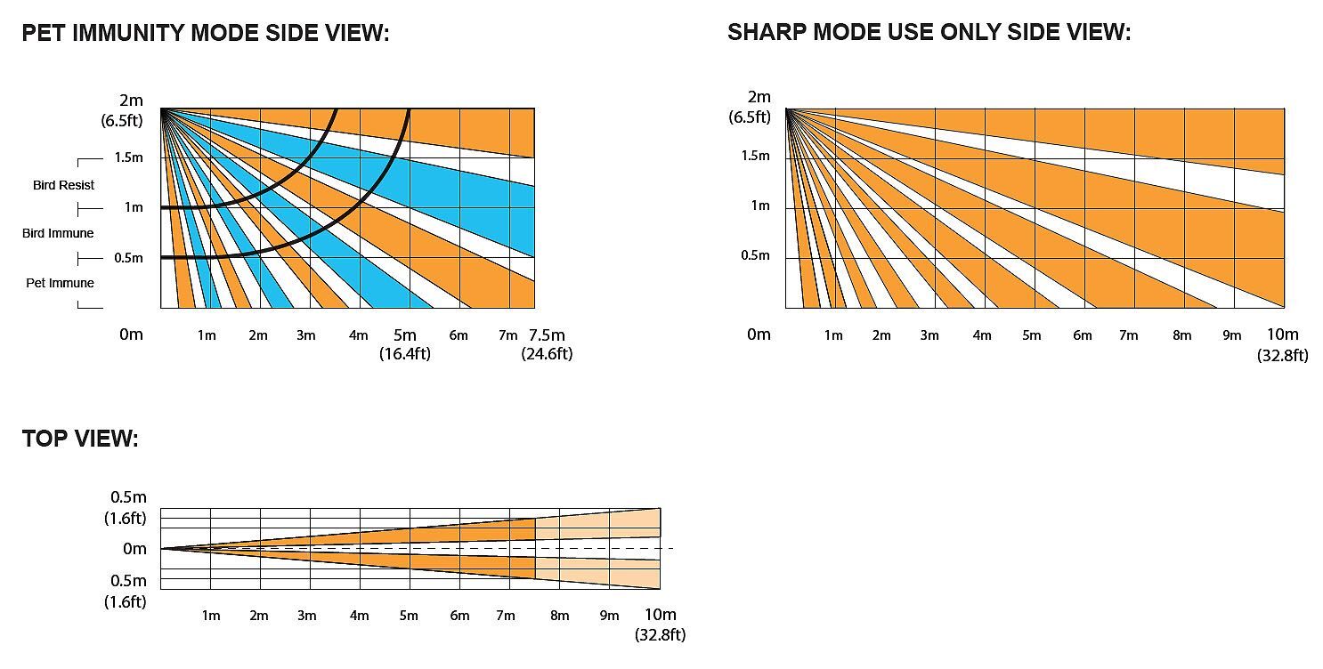 Venkovní infrapasivní duální zónový detektor pohybu s třemi režimy: úzkým paprskem 0,5 x 5m, Super imunitní režim proti zvířatům 7.5 x 2m a Ostrý režim ...