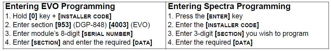 Programování modulu: 0+(instalák)+(4003)+(S/N modulu)+(sekce)+(data a volby 1-8).