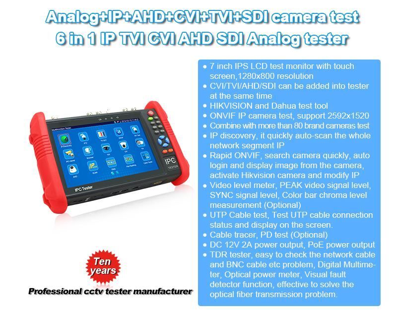 Profesionální multifunkční CCTV testovací měřící přístroj systému AHD/TVI/CVI/IP/HD-SDI/Analog/PoE test/Ethernet test, WEB prohlížeč / instalované aplikace / připojení Wi-Fi / 7“ LCD monitor s dotykovým ovládáním. Diagnostika IP kamer přes protokol ONVIF a nebo integrované protokoly. Lze použít jako jednokanálové DVR/NVR, HDMI výstup. Podporuje generátor testovacích obrazů, 12V/2A a 5V/2A výstup pro externí napájení, IP scan, PING diagnostika, PoE diagnostika, záznam a přehrávání snímku a video na microSD slot. Napájení a nabíjení pomocí přiloženého zdroje, Li-Polymer akumulátor 7.4V, 5.8Ah s ochrana proti přepětí, až 10 hodin provozu. Rozměry 243 X 158 X 48mm, váha 620g.
