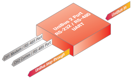 UniBus 2 Port UART poskytuje 2 vysokorychlostní, softwarově konfigurovatelné sériové porty umožňující připojení sériových periferních zařízení.