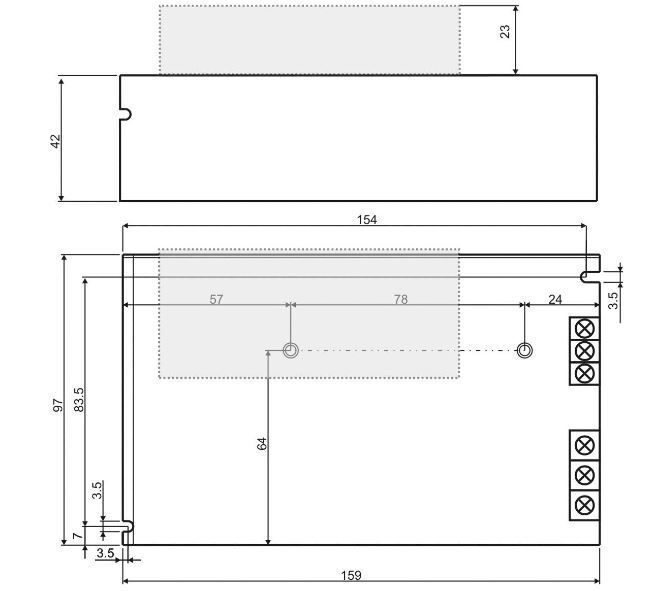 Pulsní napájecí zdroj 13,8V/5A se vstupem pro záložní akumulátor, technické výstupy o stavu zdroje a akumulátoru. Rozměry: W=159 L=97 H=65mm