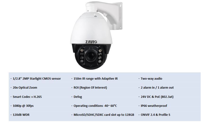 PTZ 2Mpix IP FULL HD kamera, IR LED adaptivní přísvit s dosahem 150m, objektiv 5.5-110mm 51° - 2.60°, 1/2.8" 2MP Starlight CMOS, 120dB WDR, komprese H.265/H.264/MJPEG , DEN&NOC, rozlišení 1920 x 1080 při 30 snímků/s., Micro SD/SDHC/SDXC slot, citlivost až 0,005Lux při F1.6, RS485, napájení 12VDC. Podpora přenosu TCP/IP, UDP, Muticast, DHCP, SMTP, HTTP, FTP, SNMP, RTP, RTPS. Protokol ONVIF 2.4/S. Rozměry 216 x 380mm.